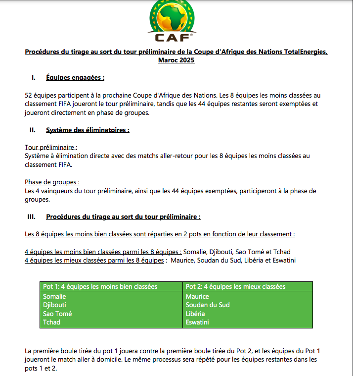 Après avoir annoncé la date du tirage au sort préliminaire de la Coupe d'Afrique des Nations "Maroc 2025", qui aura lieu, ce mardi 20 février 2024, au Caire (Égypte), la Confédération Africaine de football (CAF) a par la suite dévoilé les procédures du tirage au sort complètes.