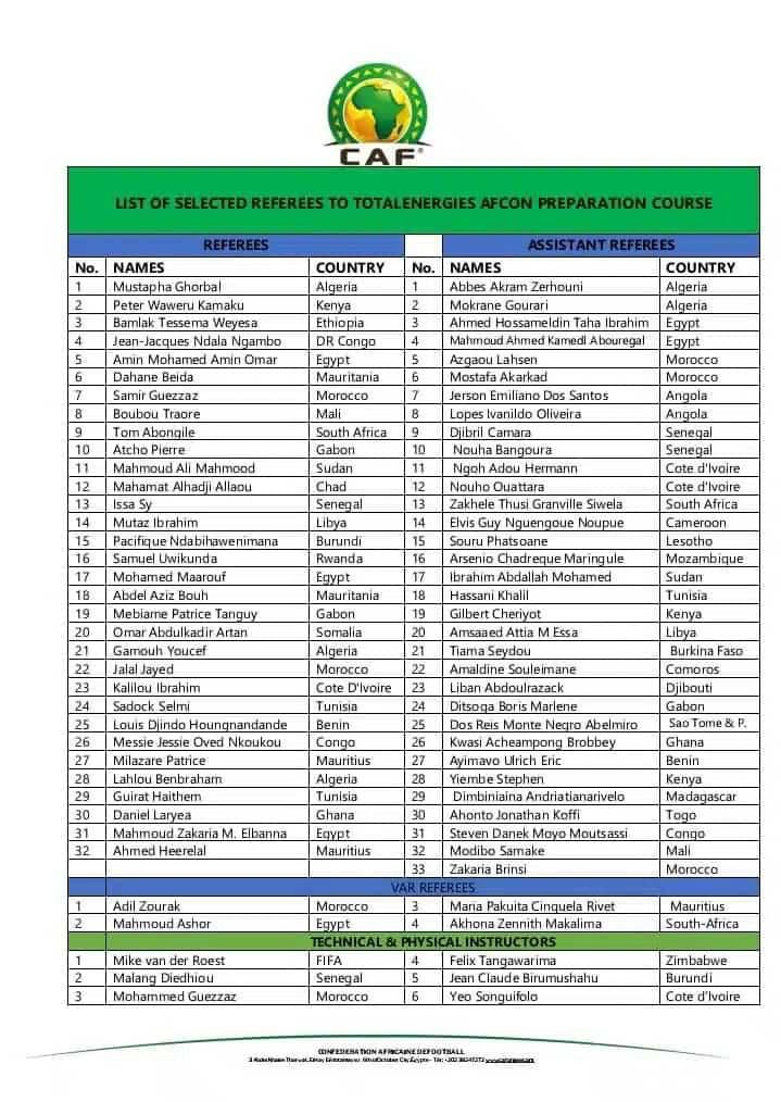 La Caf a publié la liste des arbitres qui officieront à la Can-2023 prévue en janvier-février 2024 en Côte d’Ivoire. L’instance dirigeante du football africain a retenu 32 sifflets centraux et 33 assistants. Le Sénégal est représenté par Issa Sy (central), Djibril Camara et Nouha Bangoura (assistants).