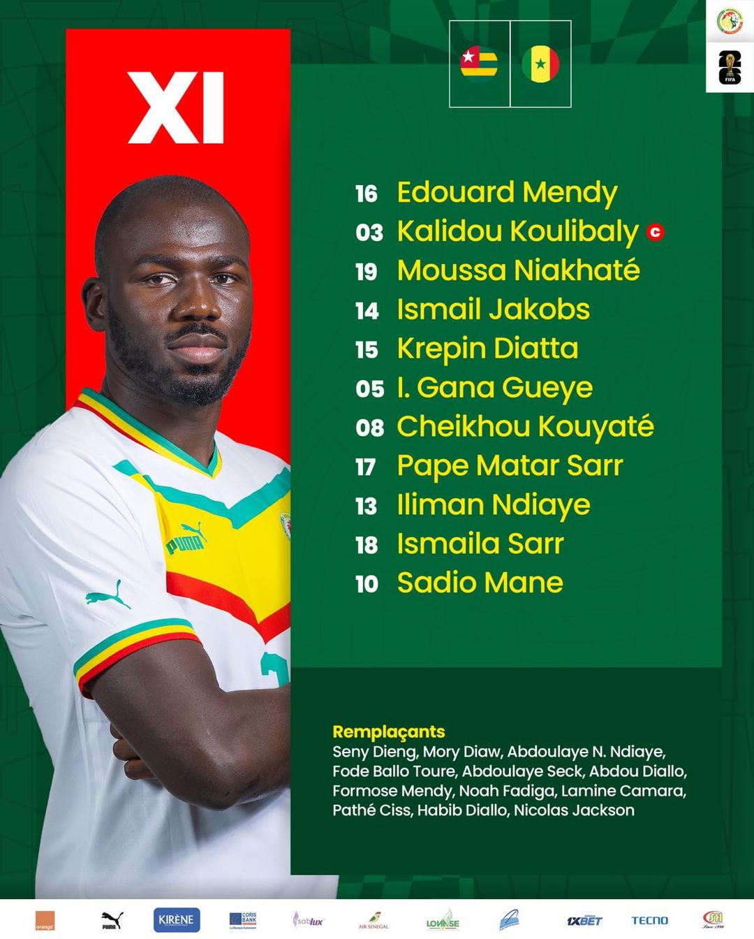 Le Togo et le Sénégal s’affrontent au stade de Kégué cet après midi pour le compte de la 2e journée des éliminatoires de la prochaine Coupe du Monde. Découvrez le onze des Lions aligné par le sélectionneur Aliou Cissé.
