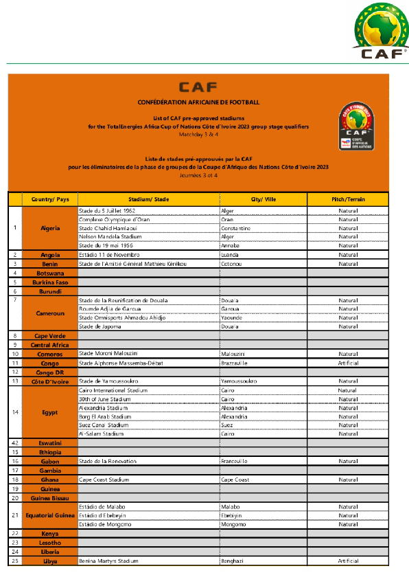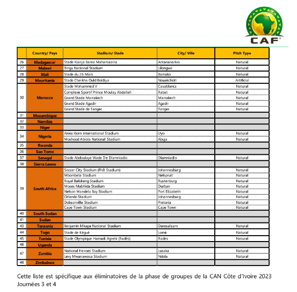 Pour la 3e et 4e journée des éliminatoires de la CAN 2023, la CAF a publié la liste des stades homologués. La Confédération africaine de football (CAF) a publié la liste de stades retenus pour abriter les éliminatoires de la CAN Côte d’Ivoire 2023 dont les journées 3 et 4 auront lieu en mars. Plusieurs nations sont privées de matchs à domicile. Pour le Sénégal, les Champions d’Afrique en titre ne pourront évoluer qu’au Stade Abdoulaye Wade de Diamniadio, le seul homologué par l’instance dirigeante du football africain, parce que le stade sénégalais répondant aux normes internationales. Leader du groupe L dans ces éliminatoires de la Coupe d’Afrique des Nations avec ses deux premiers succès contre le bénin (3-1) et le Rwanda (0-1), le Sénégal va affronter le Mozambique dans le cadre la 3e et 4e journée. Tout comme le Rwanda lors de la 2e journée, le Mozambique ne dispose d’aucun stade homologué par la CAF et va recevoir les Lions hors de ses bases. Une bonne pour les hommes d’Aliou Cissé.