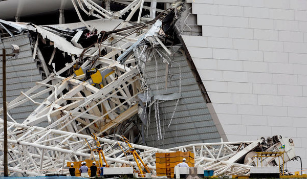 Une grue est tombée et a brisé dans sa chute une partie de la structure métallique du toit, ainsi qu'un énorme écran géant, a rapporté un photographe de l'AFP sur place.    "Le bilan...
