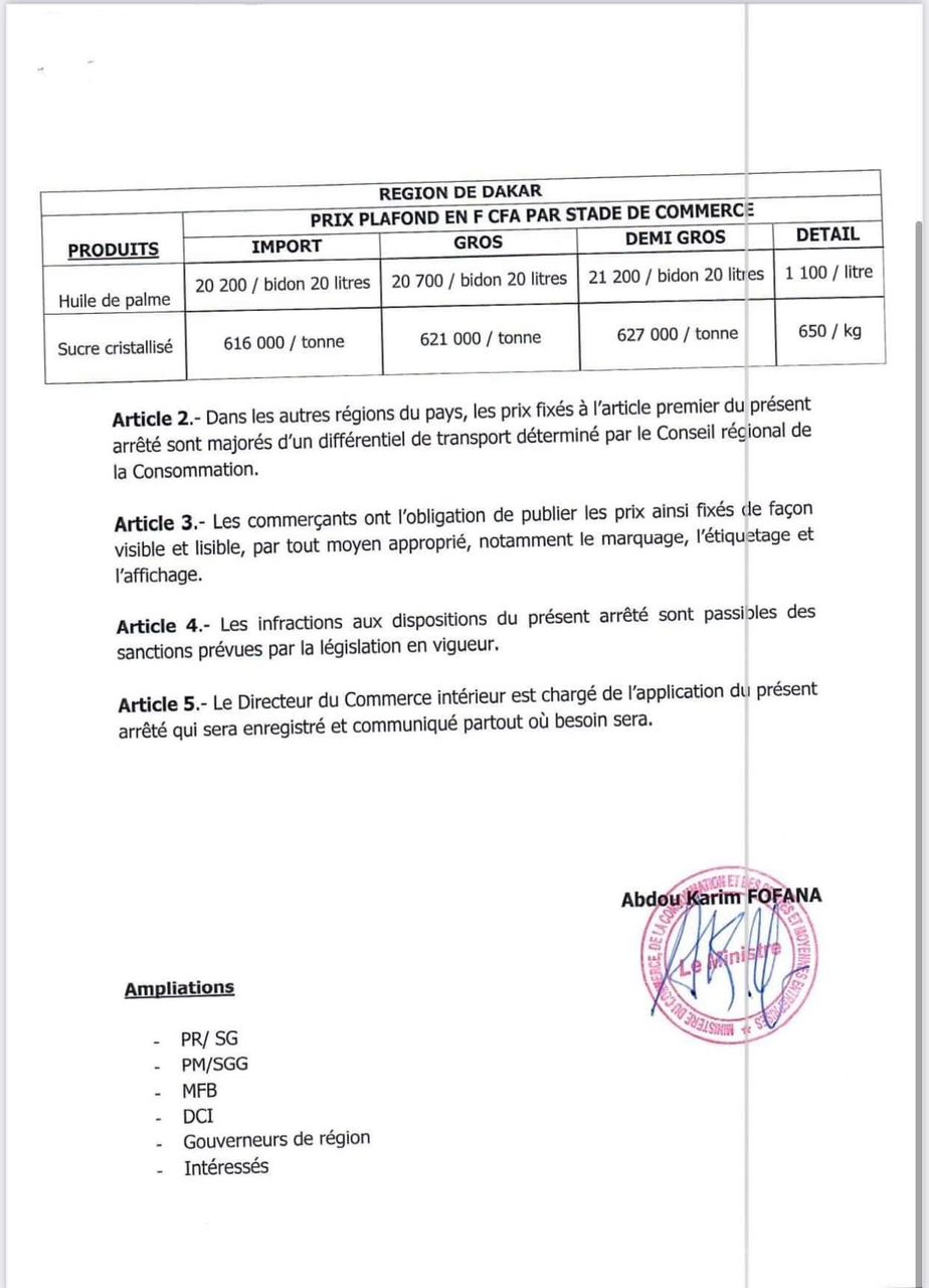 Le prix du sucre est fixé à 650 F le kilo et celui de l'huile à 1 100 F le litre à Dakar. Dans les autres régions du pays, les prix sont majorés d'un différentiel de transport déterminé par le Conseil régional de la Consommation. Les commerçants ont l'obligation de publier les prix ainsi fixés de façon visible et lisible, par tout moyen approprié, notamment le marquage, l'étiquetage et l'affichage. Les prix en gros et demi-gros sont aussi déterminés par l'arrêté ministériel (voir documents). Le ministère du Commerce, de la Consommation et des Petites et moyennes entreprises a sorti un arrêté portant homologation des prix de l'huile raffinée de palme et du sucre cristallisé dans la région de Dakar, en conformité avec les dispositions de l'article 4 de la loi n°2021-25 et du 12 avril 2021 sur les prix et la protection du consommateur et des articles 1er, 3 et 6 du décret n°2022-89 du 17 janvier 2022 relatif aux régimes de prix et aux procédures de dénouement du contentieux économique, les prix plafond de l'huile raffinée de palme et du sucre cristallisé. Dans la même dynamique, le département du Commerce avertit que les infractions aux dispositions du présent arrêté sont passibles des sanctions prévues par la législation en vigueur et que le directeur du Commerce intérieur est chargé de l'application du présent arrêté qui sera enregistré et communiqué partout où besoin sera.