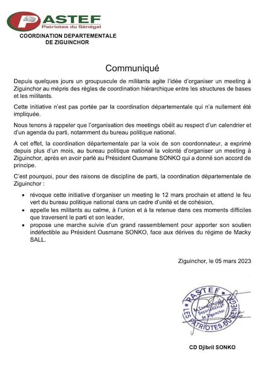 Un meeting à l’initiative de militants du parti, et prévu le 12 mars à Ziguinchor, n’a pas l’onction de la Coordination Départementale de PASTEF, qui l’a tout simplement révoqué.