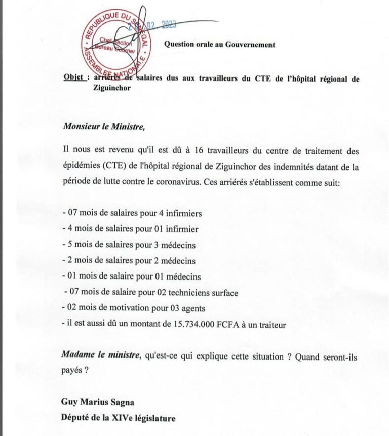 Le député Guy Marius Sagna a encore déposé sur la table du président de l’Assemblée nationale Amadou Mame Diop dix (10) questions orales et deux (02) questions d’actualité. Pour les 10 questions orales, il s’agit de: 01- question orale portant sur les discriminations salariales frappant 11 chefs de division à l’agence de la sécurité de proximité 02 – question orale portant sur des arriérés de salaire dus à 16 travailleurs du centre de traitement des épidémies (CTE) de l’hôpital régional de Ziguinchor 03- question orale portant sur l’indexation des salaires des travailleurs des bateaux de pêche sur la convention de l’OIT de 2007 04- question orale portant sur les difficultés des sénégalais établis en France à trouver du travail du fait de l’ambassade de France au Sénégal 05 – question orale portant sur le désert syndical dans les entreprises de centres d’appels 06- question orale portant sur la protection des populations des villages de Tchiky et environs face aux cimenteries 07 – question orale portant sur la négligence de la filière porcine 08- question orale portant sur la privatisation de l’université virtuelle du Sénégal et de la promotion 6 09- question orale portant sur l’état des recherches pour retrouver l’adjudant-chef Didier Badji 10- question orale portant sur les sanctions de 150 autorités maliennes de la transition Pour les 02 questions d’actualité, il s’agit de: 1- question d’actualité portant sur le rôle des mercenaires de la désinformation dans la réélection du président-candidat Macky Sall en 2019: « scandale international TEAM JORGE » 2- question d’actualité portant sur les nervis et milices privées aux côtés des forces de sécurité GMS,.