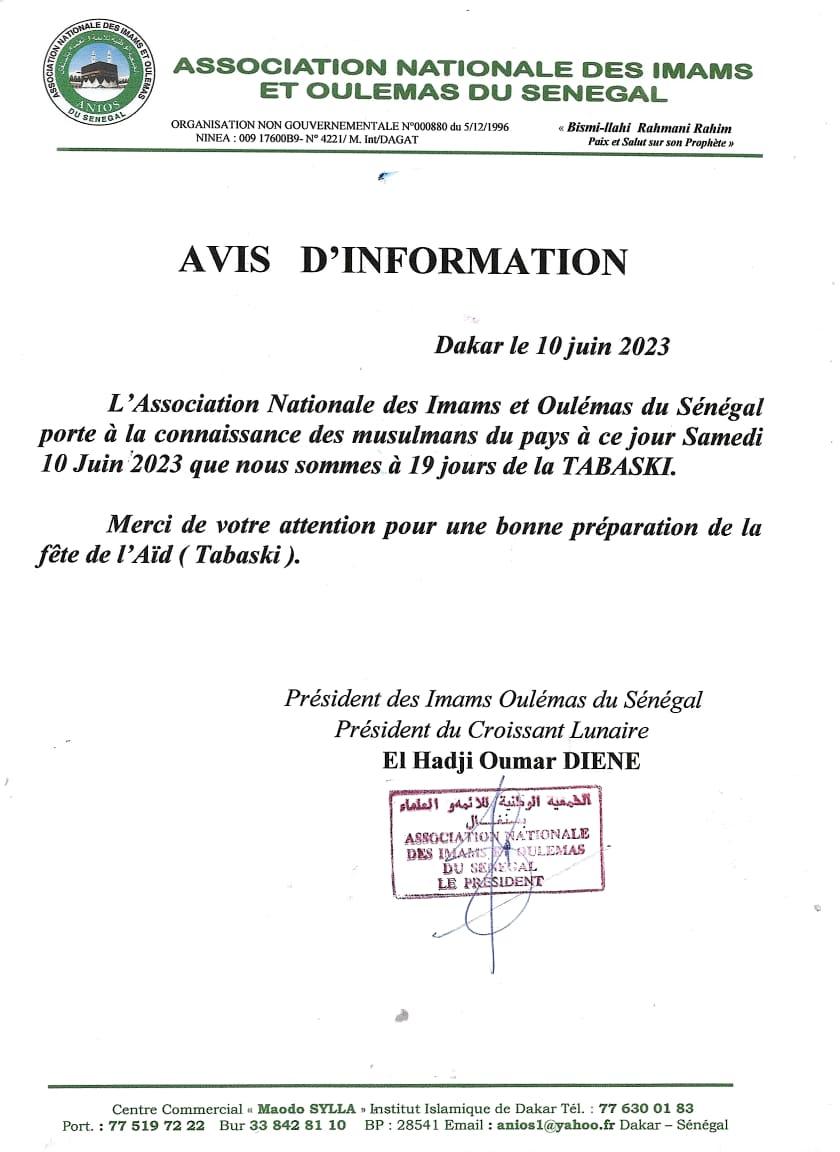 La Tabaski sera célébrée dans exactement 19 jours. C’est ce qu’a dit l'Association nationale des Imams et Oulémas du Sénégal (Anios). Celle-ci porte à la connaissance des musulmans du pays, dans son communiqué de presse signé par l'imam Elhadj Oumar Diène, qu’ «à ce jour Samedi 10 Juin 2023, nous sommes à 19 jours de la Tabaski». Elle devrait donc être célébrée le Jeudi 29 juin prochain. Ci-dessous leur document